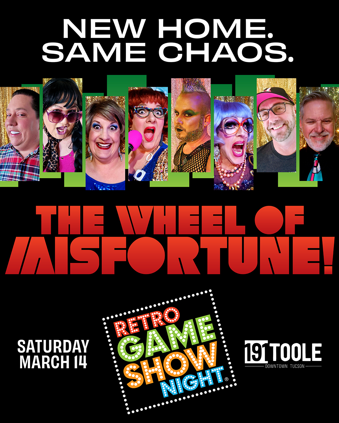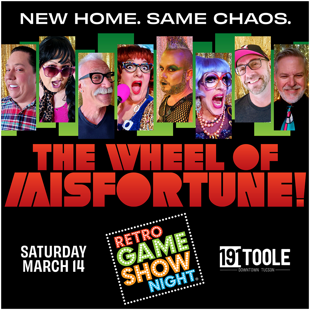New Home. Same Chaos. Retro Game Show Night is moving to 191 Toole, and we’re christening the new digs with The Wheel of Misfortune – hosted by Chatty Kathee with Swish Manley “assisting” in the most legally ambiguous way. Featuring celebrity guests Fulta Burstyn, Bernaise, Nelmar 27 McGee, and Parker – so bring your luck and whatever dignity you’re willing to lose.