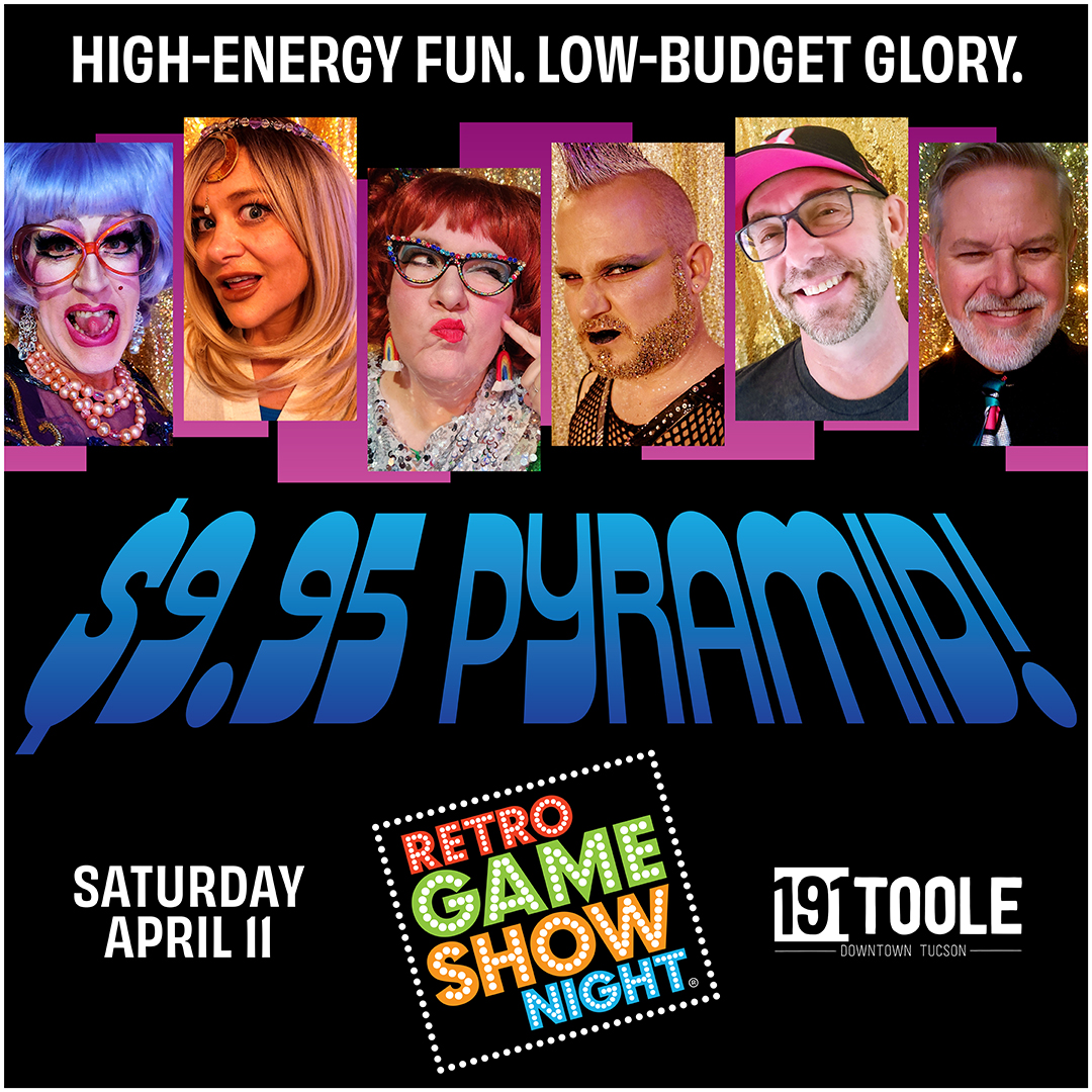 Retro Game Show Night returns to 191 Toole with The $9.95 Pyramid hosted by the glamorously garrulous Chatty Kathee, “assisted” by the scintillating Swish Manley, and featuring dazzling celebrity guests Fulta Burstyn and Dharma Davenport! Fast clues, bad guesses, and confidence that cannot be justified.
